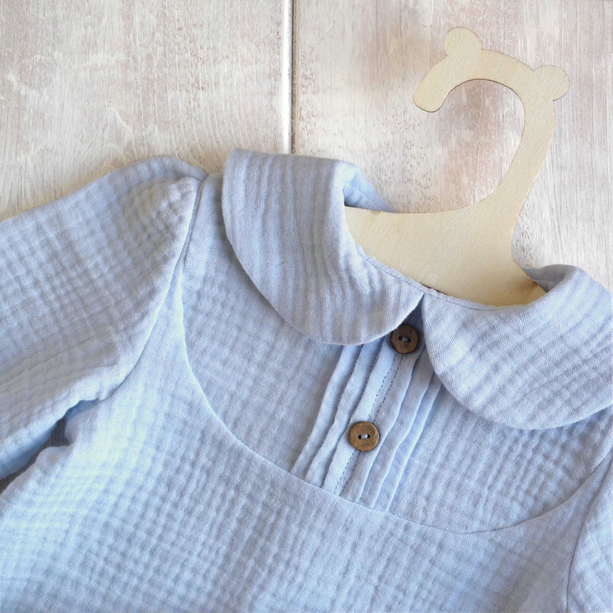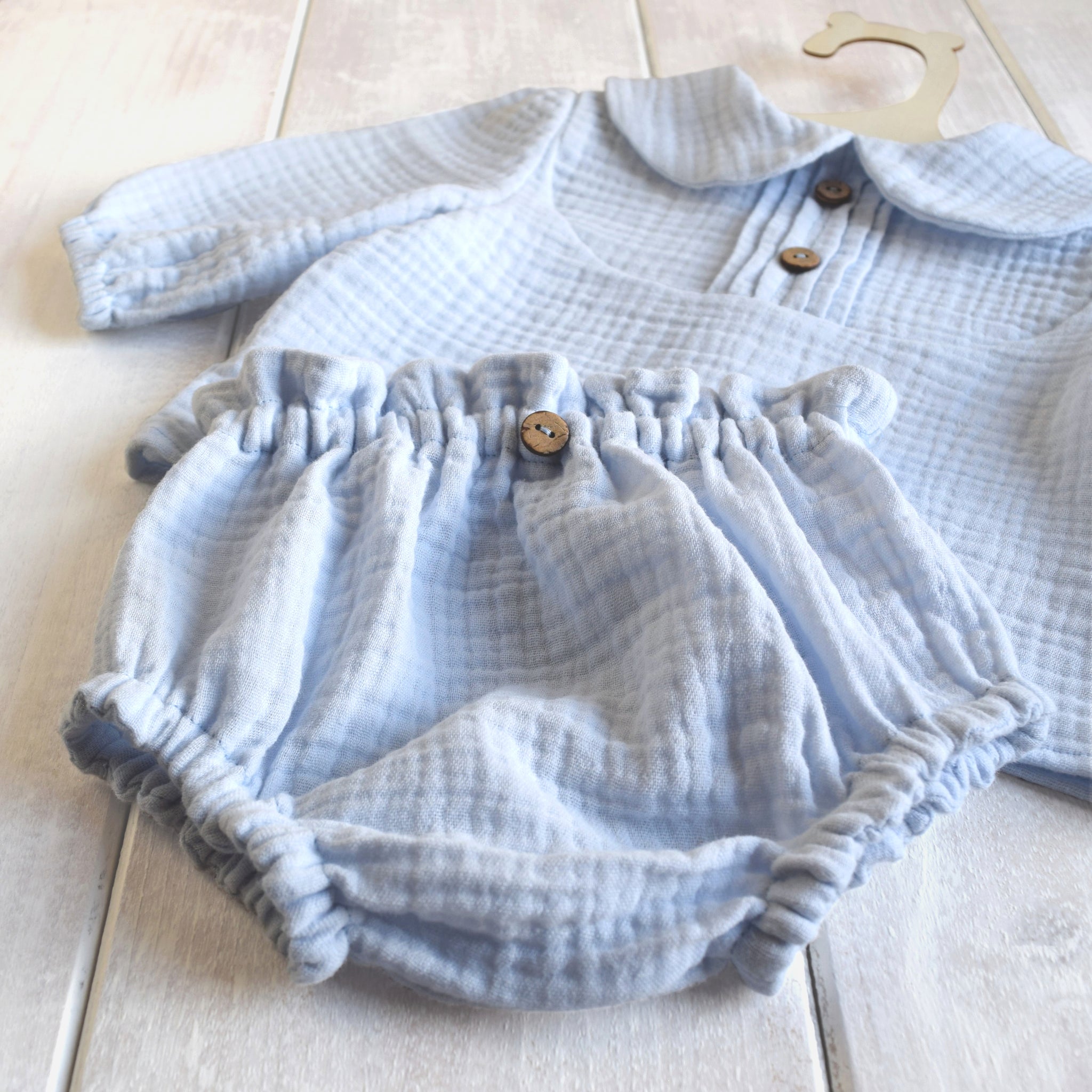 E' risaputo che la mussola di cotone è il tessuto ideale per affrontare le calde giornate estive. Grazie alla sua leggerezza e morbidezza, il completino in mussola è un must have da avere nel guardaroba dei vostri piccoli. La camicia, con apertura sul retro, è impreziosita da una particolare cucitura a pieghe e bottoni in legno di cocco.