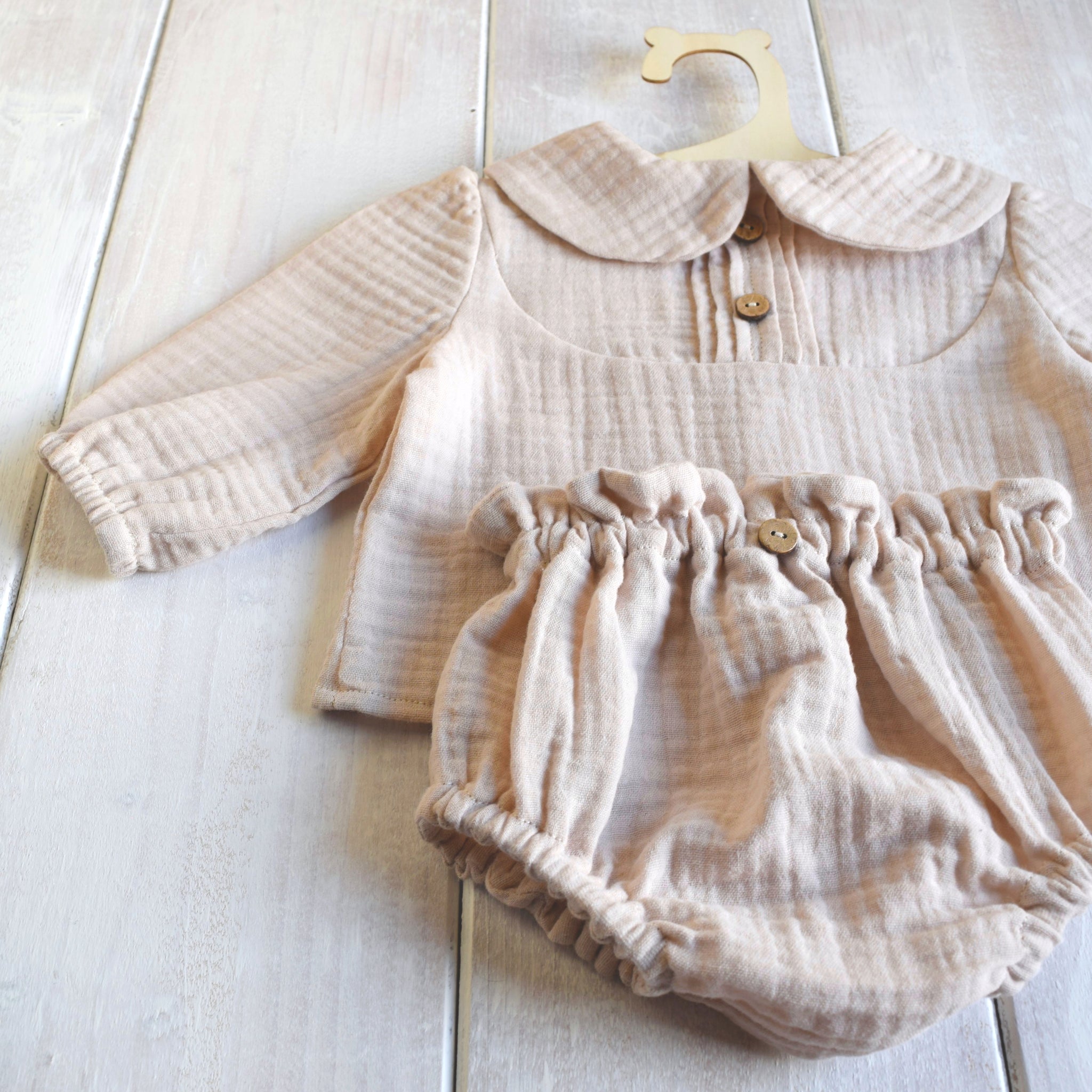 E' risaputo che la mussola di cotone è il tessuto ideale per affrontare le calde giornate estive. Grazie alla sua leggerezza e morbidezza, il completino in mussola è un must have da avere nel guardaroba dei vostri piccoli. La camicia, con apertura sul retro, è impreziosita da una particolare cucitura a pieghe e bottoni in legno di cocco.