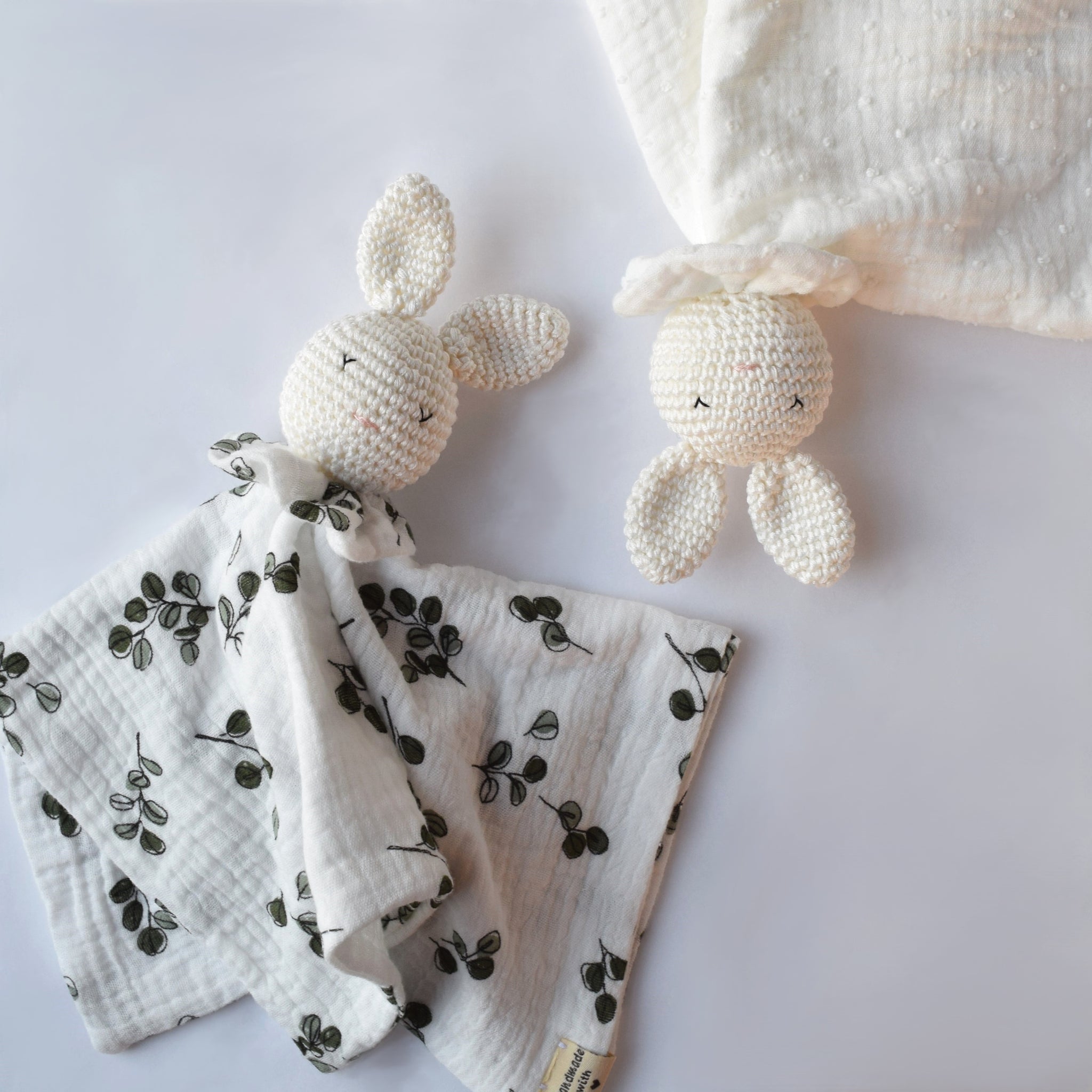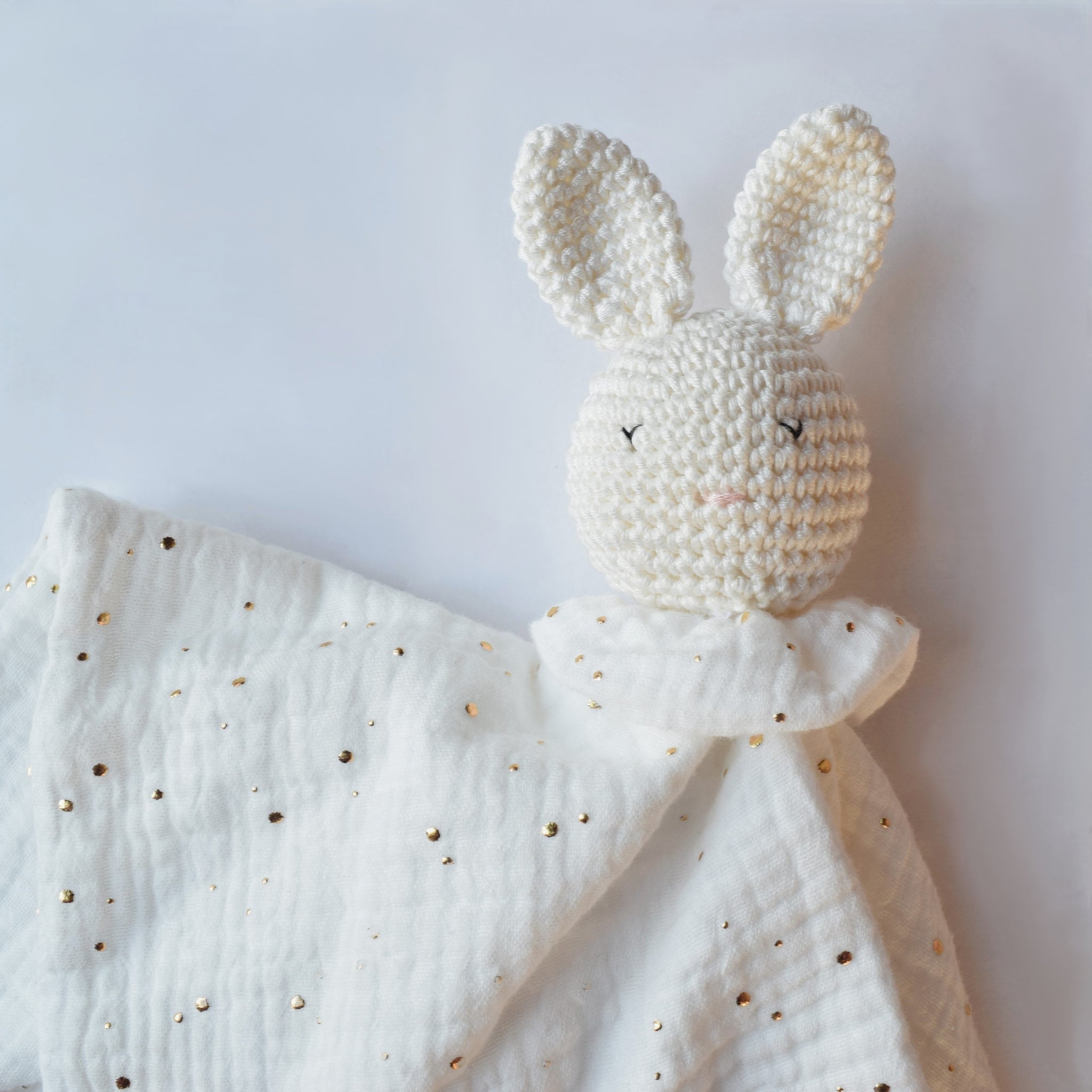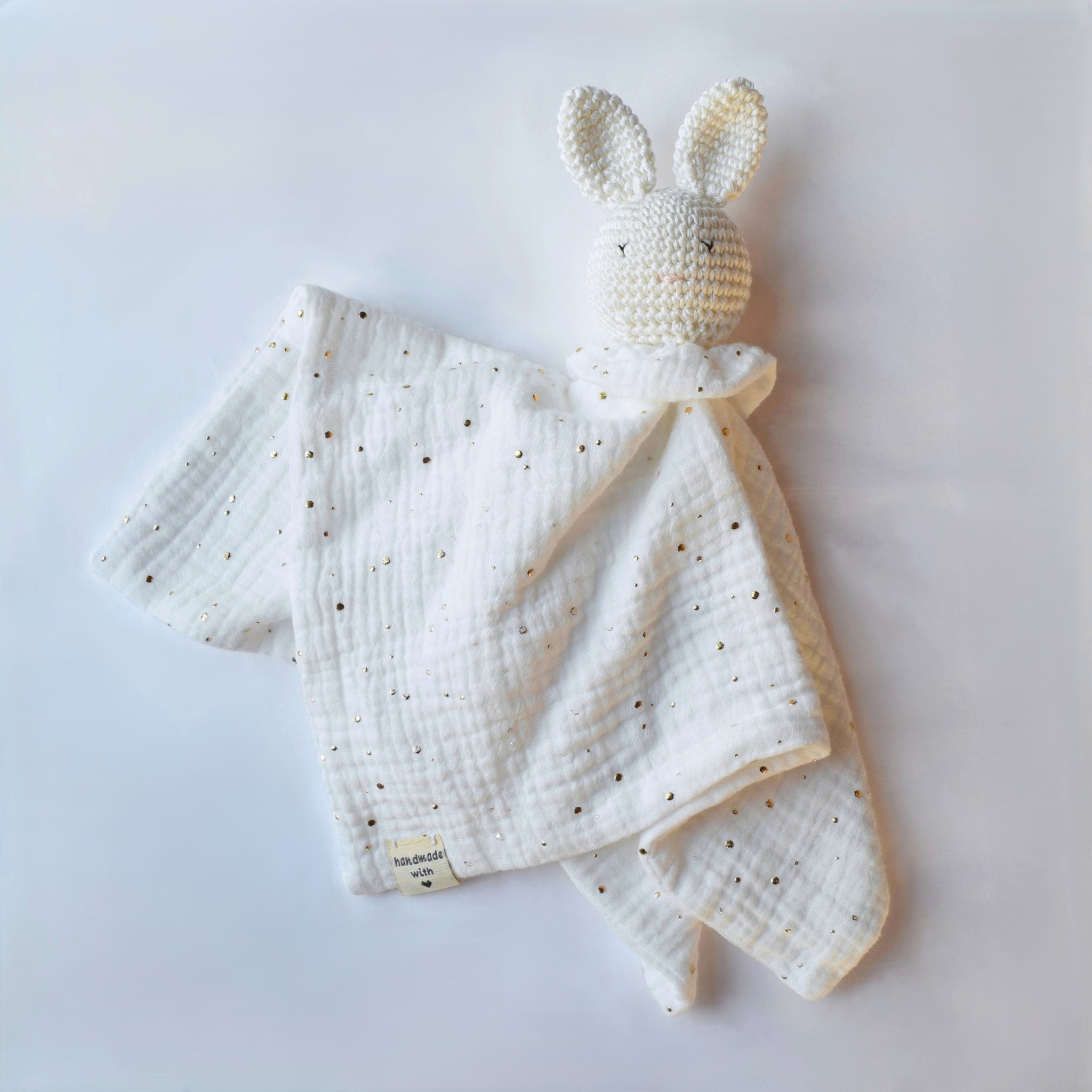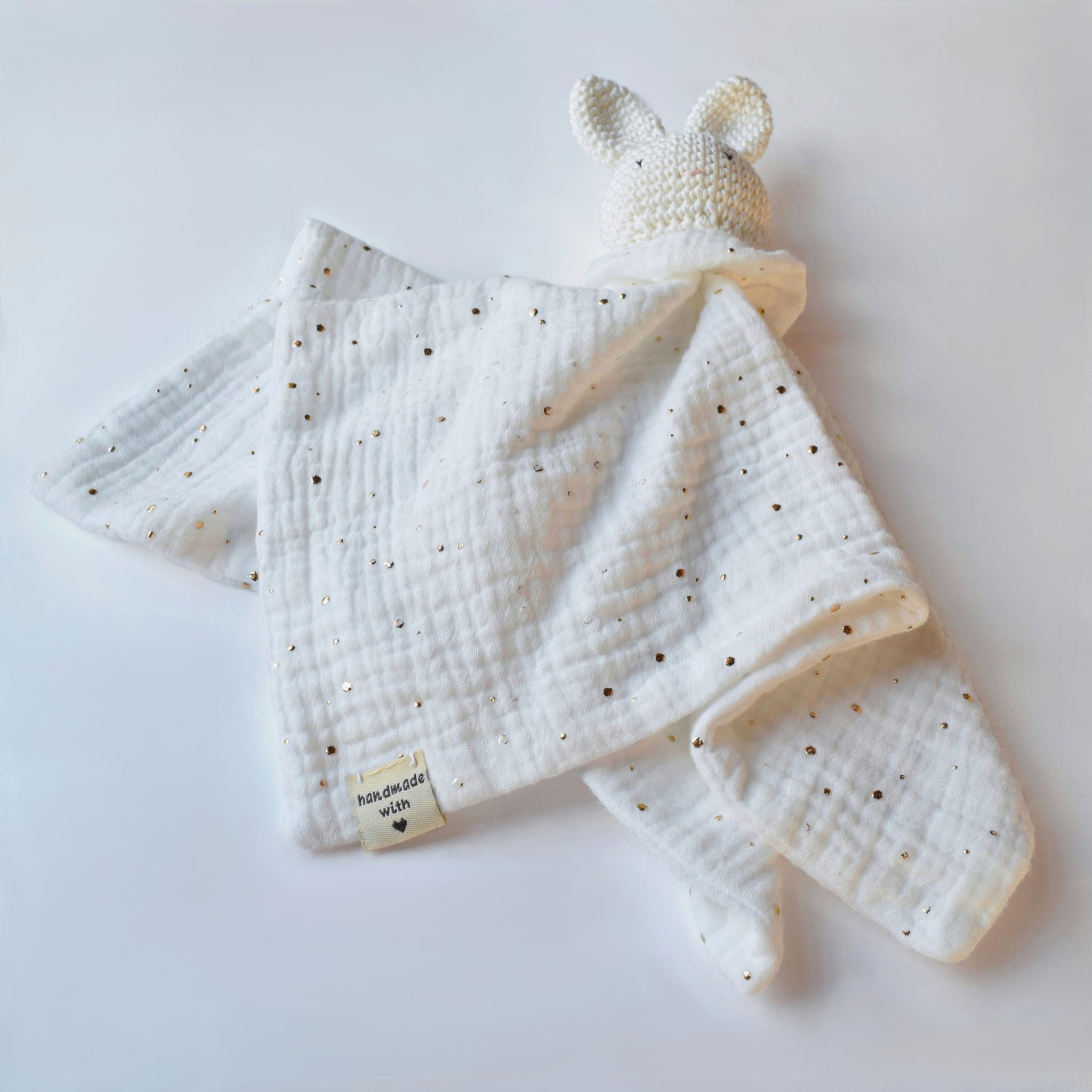Design unico e morbidezza infinita... doudou, dalla forma di un coniglietto, realizzato interamente a mano in mussola di cotone e dettaglio in maglia. È un regalo nascita unico e perfetto per accompagnare i più piccoli nei momenti di gioco e della nanna.