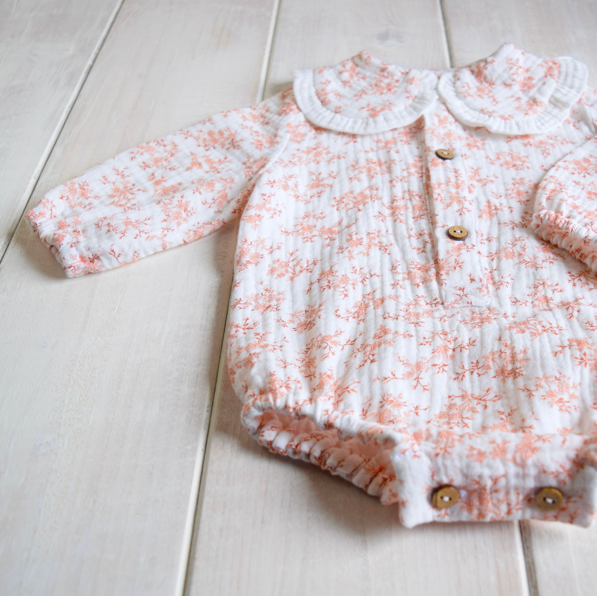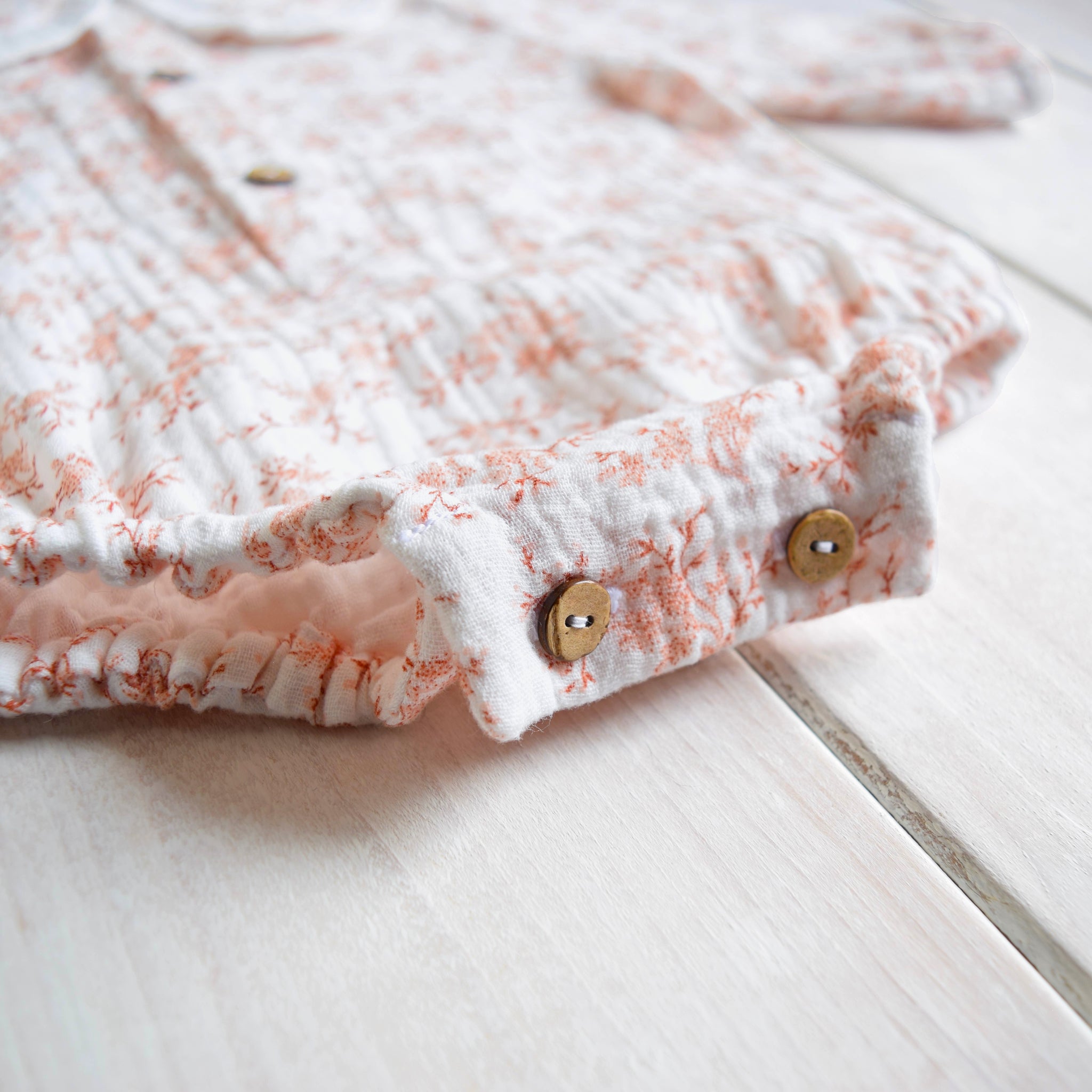 Dolcissimo ed elegante grazie al colletto con volant a contrasto, il pagliaccetto della linea new born è il capo perfetto per la nascita della tua piccola. Realizzato interamente a mano, è dotato di graziosi bottoncini in legno di cocco per una comoda chiusura sul davanti. Il tessuto in mussola di cotone, morbidissimo e delicato, è particolarmente adatto per la pelle sensibile dei neonati.