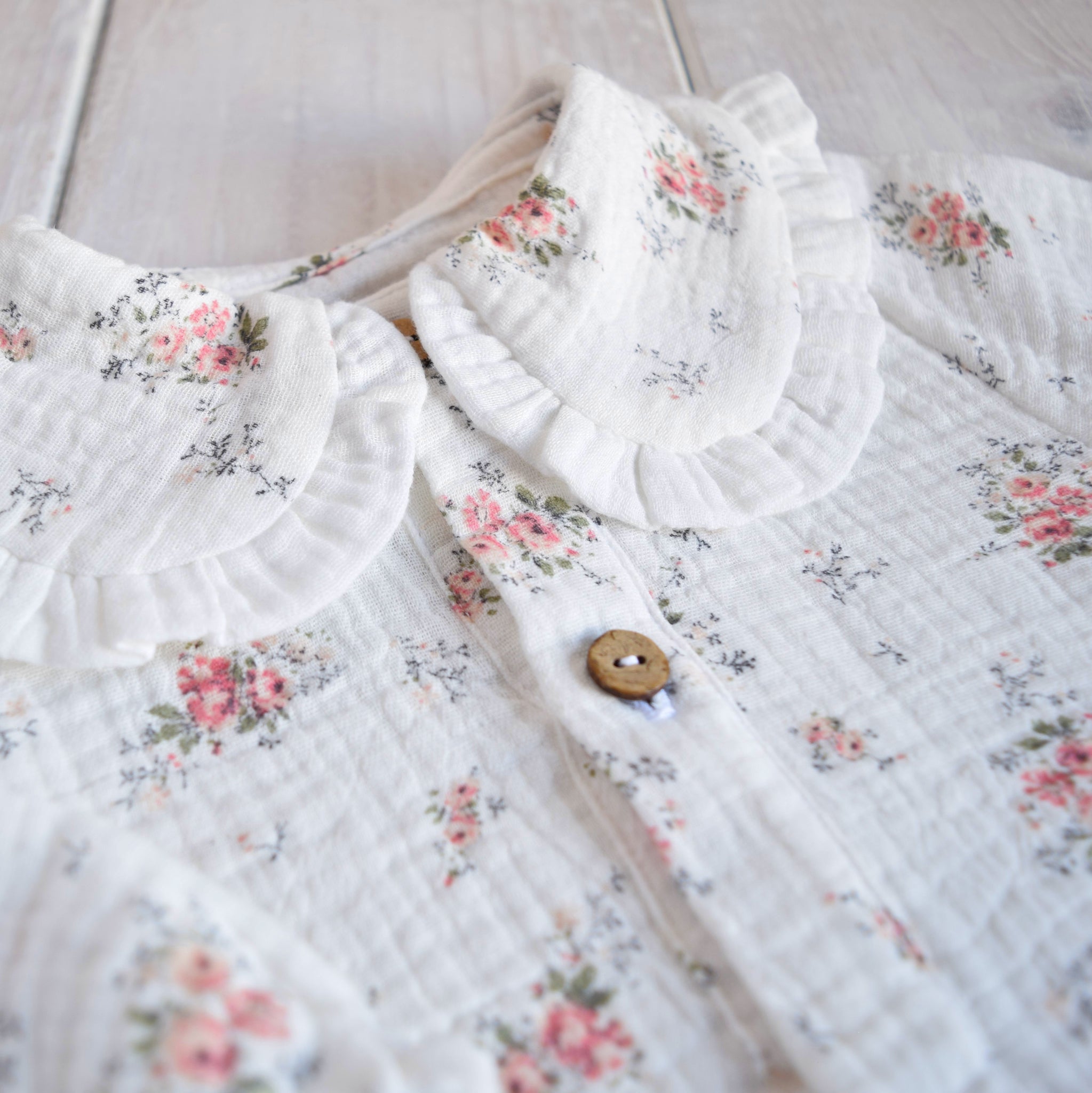 Dolcissimo ed elegante grazie al colletto con volant a contrasto, il pagliaccetto della linea new born è il capo perfetto per la nascita della tua piccola. Realizzato interamente a mano, è dotato di graziosi bottoncini in legno di cocco per una comoda chiusura sul davanti. Il tessuto in mussola di cotone, morbidissimo e delicato, è particolarmente adatto per la pelle sensibile dei neonati.